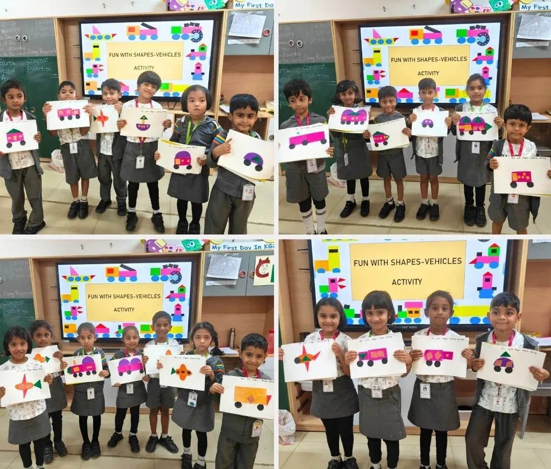 On 28th January 2026, KG2 children participated in the Fun with Shapes – Vehicle activity. Using circles, squares, rectangles, and triangles, the children creatively designed their own vehicles. The activity helped enhance shape recognition, fine motor skills, logical thinking, and creativity. The children proudly showcased their colorful creations with great confidence. 🚗✨