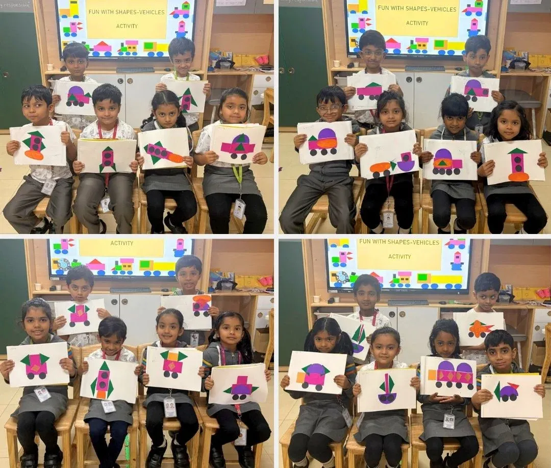 On 28th January 2026, KG2 children participated in the Fun with Shapes – Vehicle activity. Using circles, squares, rectangles, and triangles, the children creatively designed their own vehicles. The activity helped enhance shape recognition, fine motor skills, logical thinking, and creativity. The children proudly showcased their colorful creations with great confidence. 🚗✨