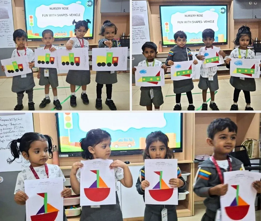 By matching and identifying shapes like circle, square, rectangle, and triangle in different vehicles, children learned while playing and observing. Learning becomes joyful when lessons roll in on wheels! 🚜💛